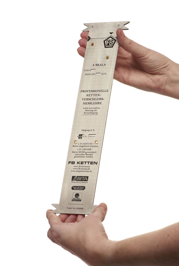 S pomocí měřiče (někdy též nazývaného KML – dle německého Kettenverschleissmesslehre) změříte opotřebení válečkových, fleyerových i dalších typů zvedacích a hnacích řetězů s roztečí 3/8 až 3 palce.