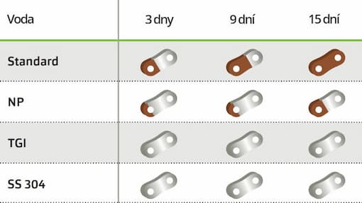 Tabulka níže ilustruje rozdíly v odolnosti řetězů vůči korozi při působení vody. Přestože standardní i poniklované řetězy vykazují zřetelné stopy koroze již po několika dnech, KettenWulf TGI a SS si naopak po více než dvou týdnech zachovávají neporušený povrch.