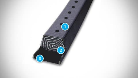 Tělo řemenů tvoří speciální textilie, která je při výrobě složena do spirály, aby tak vznikly pevné vrstvy. Textilie se vyznačuje vynikající odolností proti opotřebení.