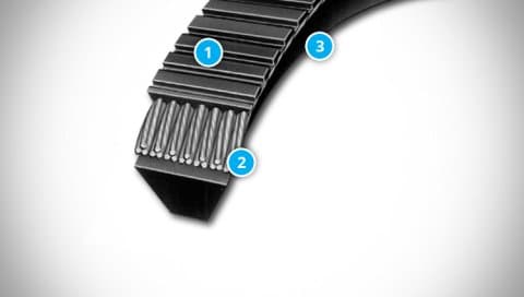 Řemeny jsou vyrobeny z vysoce odolného polyuretanu a ze speciálních polyesterových tažných vláken. Mají příčně drážkovaný hřbet pro optimalizaci pružnosti.