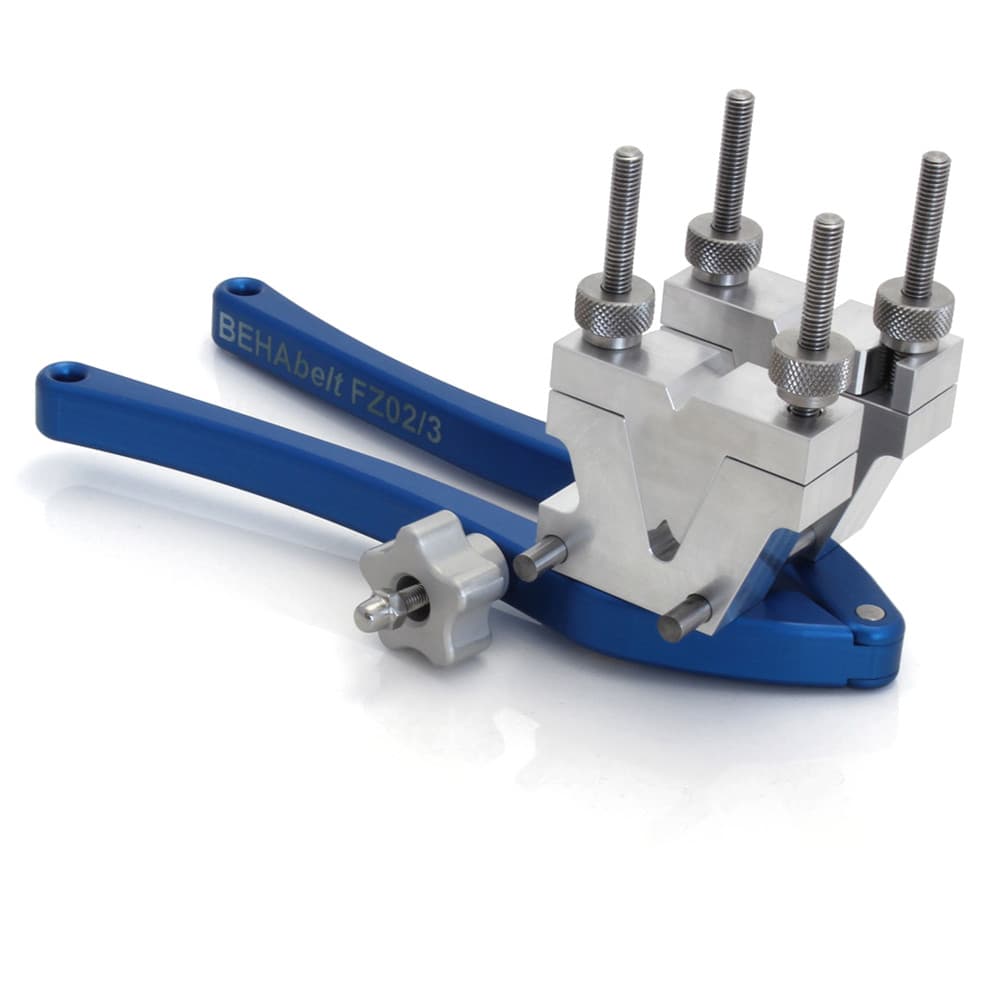 BEHA FZ02/3 - upínací kleště je zařízením k přípravě spojů a spojování kruhových, klínových a profilových metráží z polyuretanu (PU) či polyesteru (PES) v nekonečné hnací a transportní řemeny svařením.