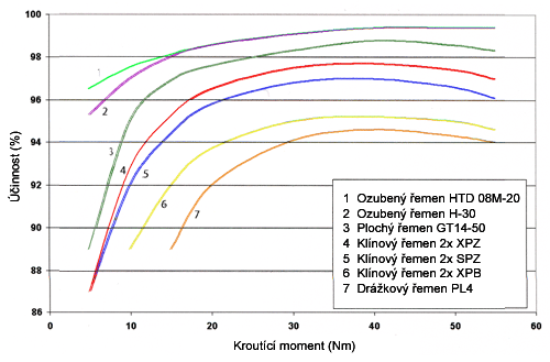 - Menší tloušťka řemenu má nižší ztráty ohybem. To je další důvod, proč u ozubených a plochých řemenů je účinnost vyšší. U klínových řemenů vzniká ze ztrát způsobených ohybem teplo. Vliv vyšší tloušťky řemene na účinnost můžeme sledovat také u řemenů XPZ než u SPZ, resp. XPB, viz graf výše.